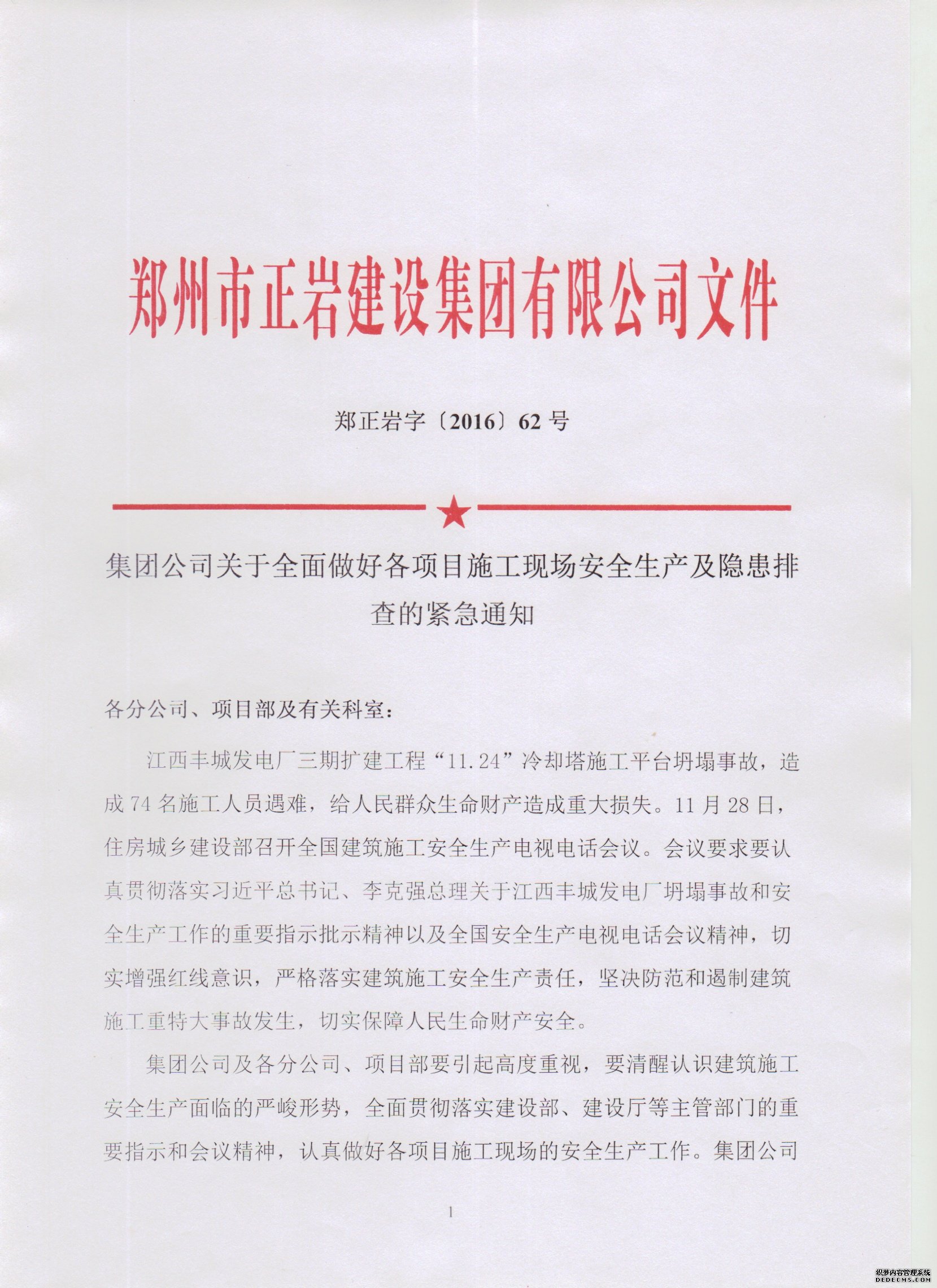 郑赌nba篮球正规官网字〔2016〕62号 集团公司关于全面做好各项目施工现场安全生产及隐患排查的紧急通知