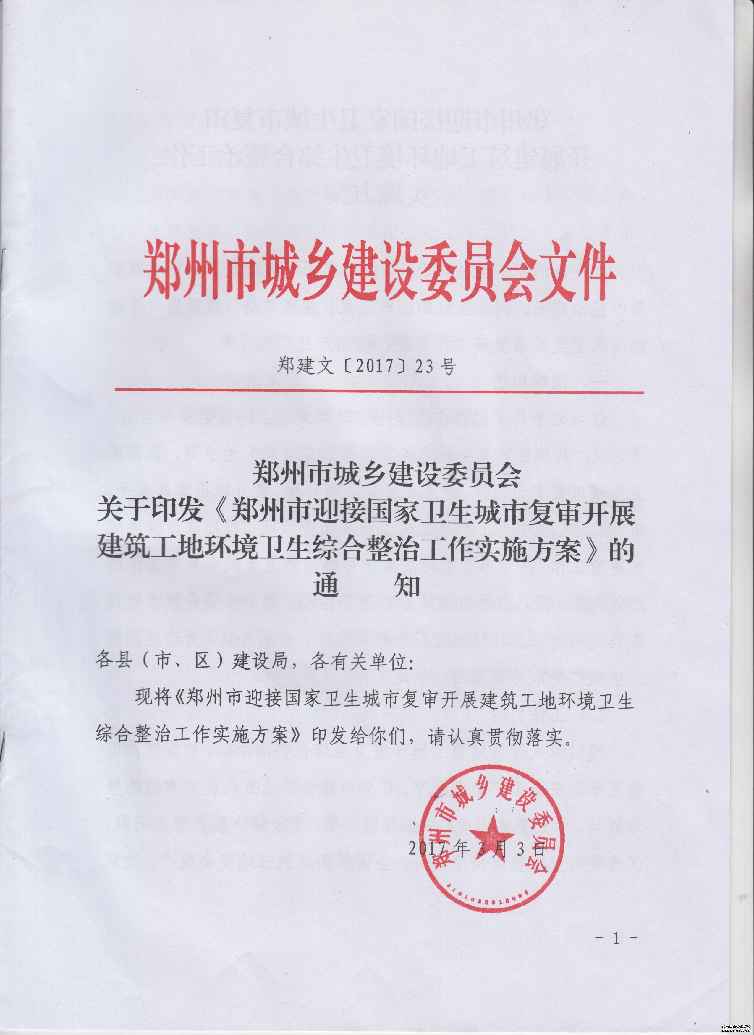 郑建文【2017】23号 郑州市城乡建设委员会关于印发《郑州市迎接国家卫生城市复审开展建筑工