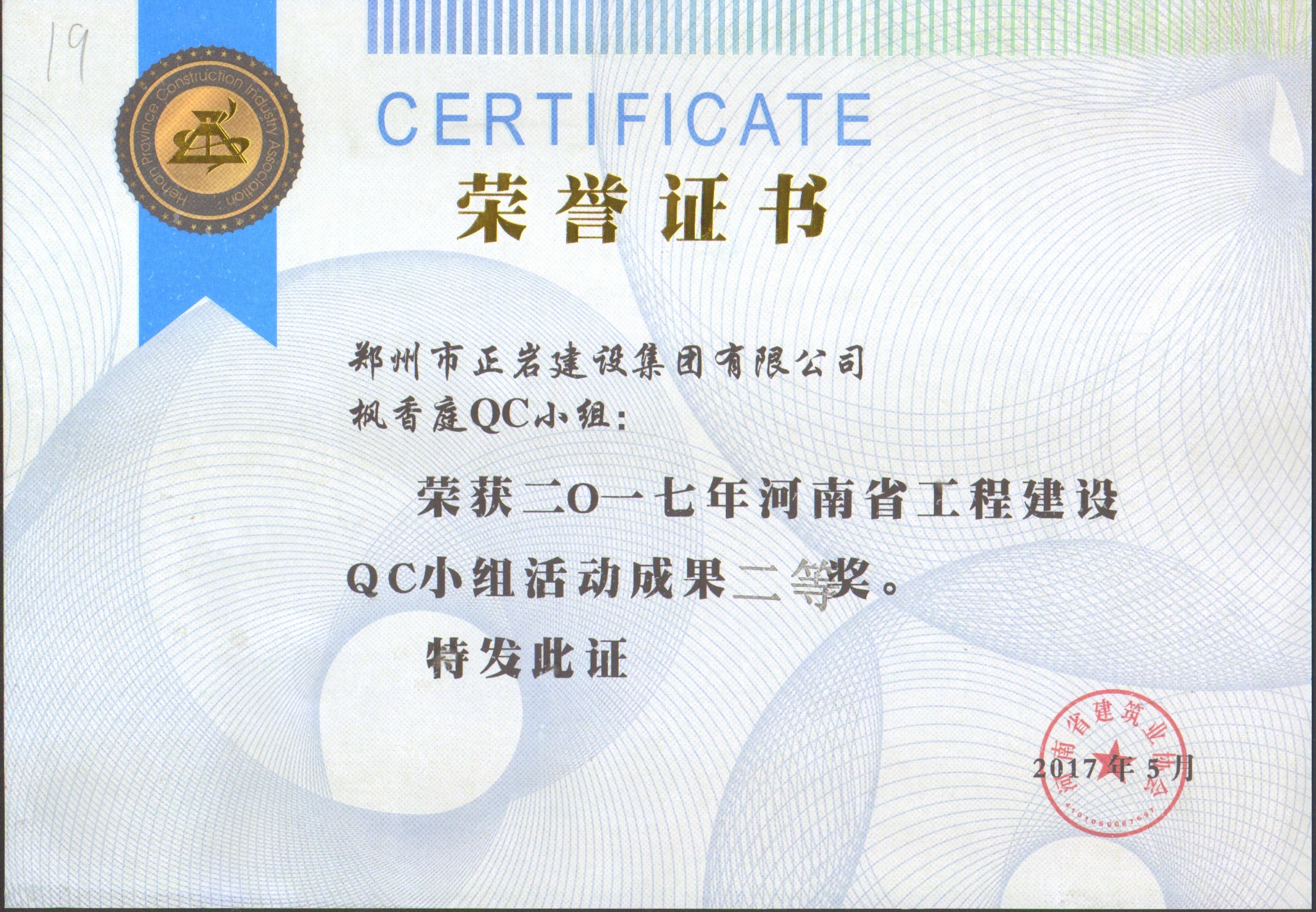 5月5至6日,2017年河南省工程建设优秀QC小组成果交流会在嵩阳饭店举行,全省有122项发布成果和近440项交流成果,其中公司“枫香庭QC小组”获得河南省工程建设优秀QC小组二等奖。