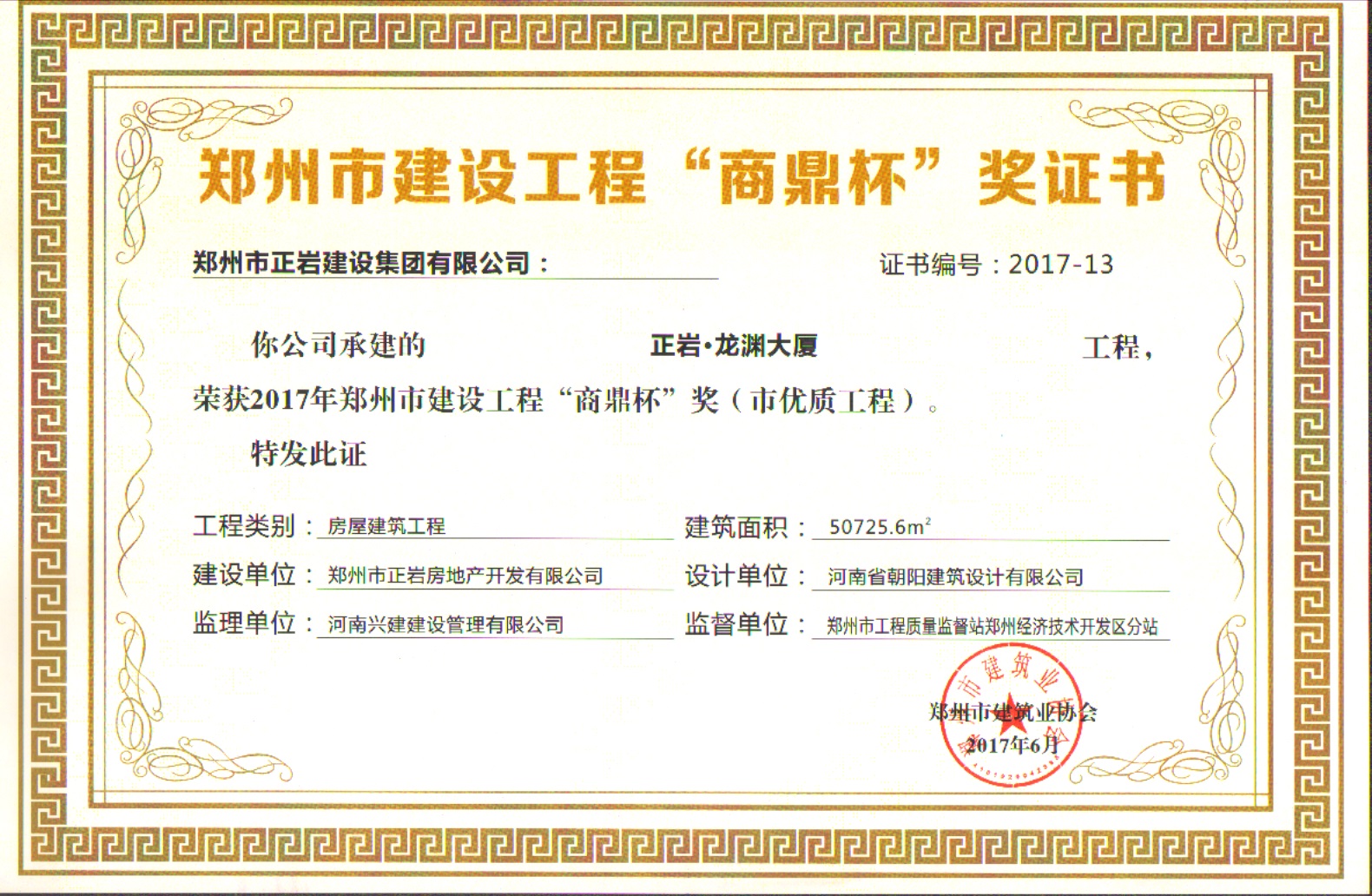 2017承建赌nba篮球正规官网龙渊大厦荣获郑州市建设工程商鼎杯奖