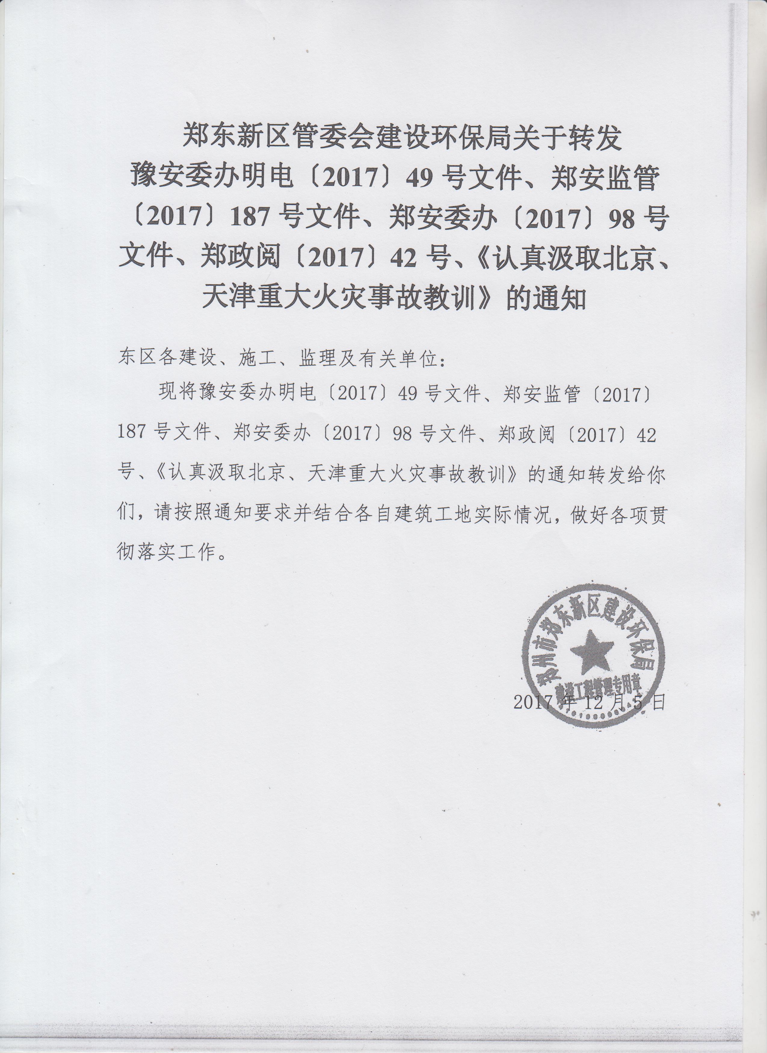 关于转发豫安委办明电【2017】49号文件、郑安监管【2017】187号文件、郑安委办【2017】98号文件、郑政阅【2017】42号、《认真汲取北京、天津重大火灾事故教训》的通知