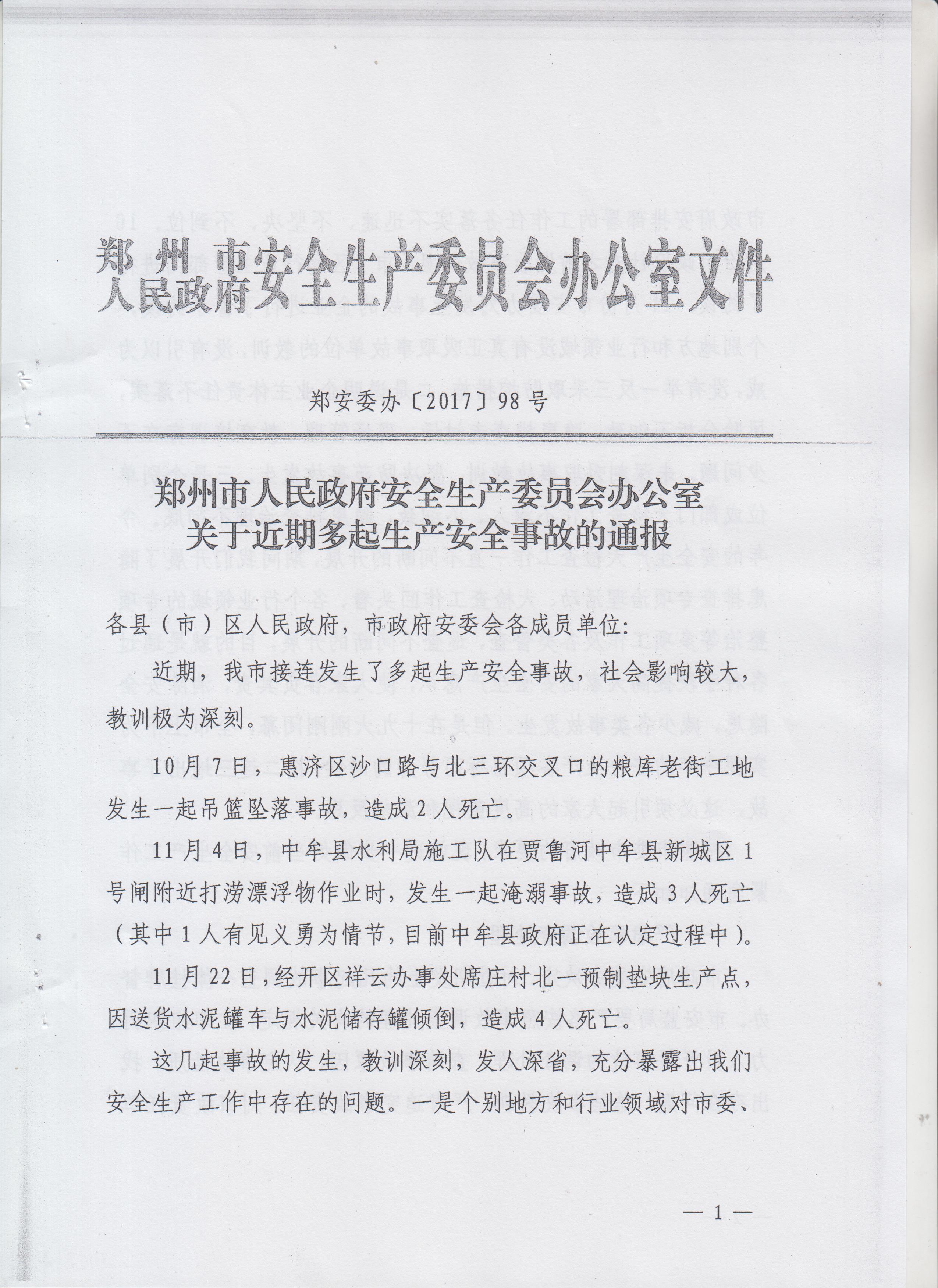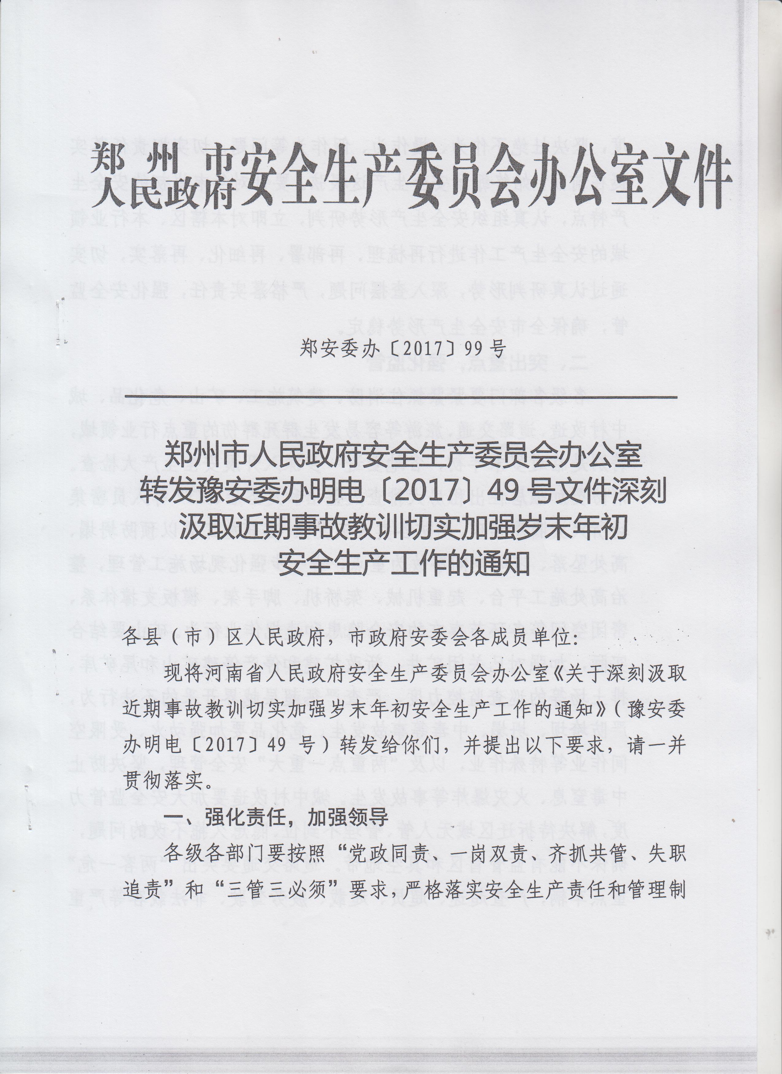 关于转发豫安委办明电【2017】49号文件、郑安监管【2017】187号文件、郑安委办【2017】98号文件