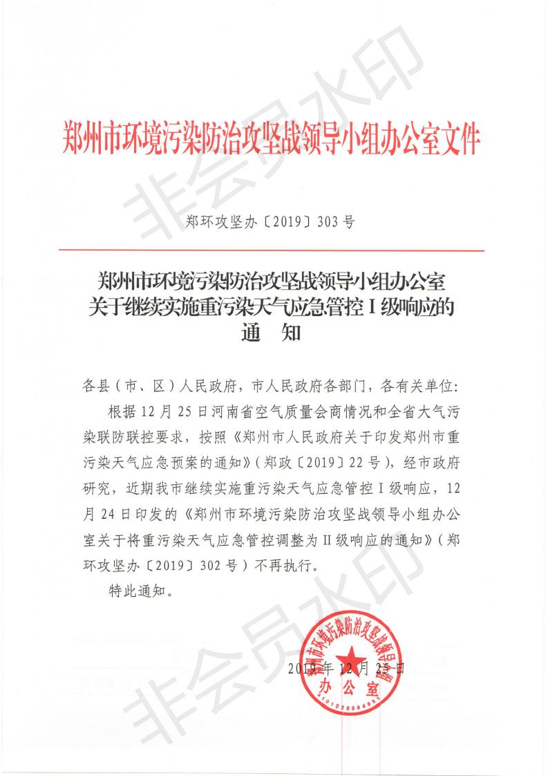 郑州市环境污染防治攻坚战领导小组办公室关于继续实施重污染天气应急管控Ⅰ级响应的通知