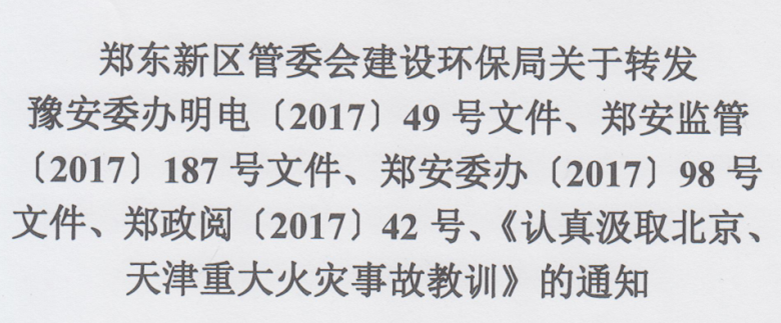 关于转发豫安委办明电【2017】4 关于转发豫安委办明电【2017】49号文件、郑安监管【2017】187号文件、郑安委办【2017】98号文件、郑政阅【2017】42号、《认真汲取北京、天津重大火灾事故教训》的通知...[ 了解详情]